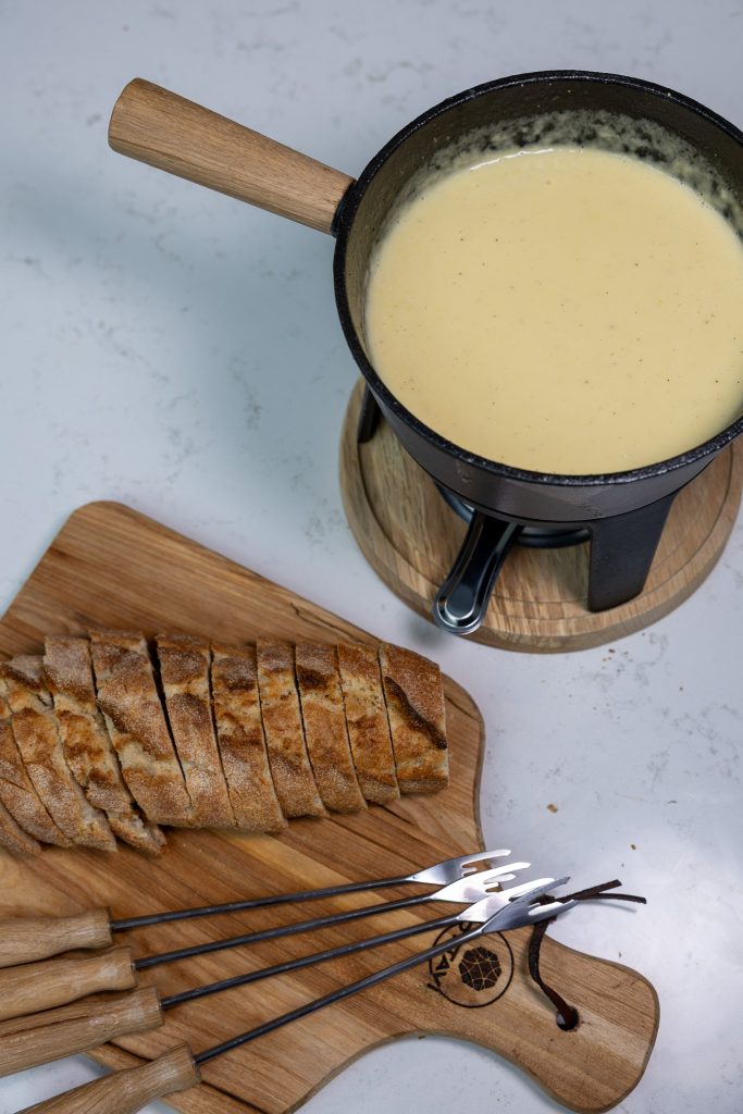 De fonduepan inwrijven met een gehalveerde teen knoflook voor een subtiele smaak.
