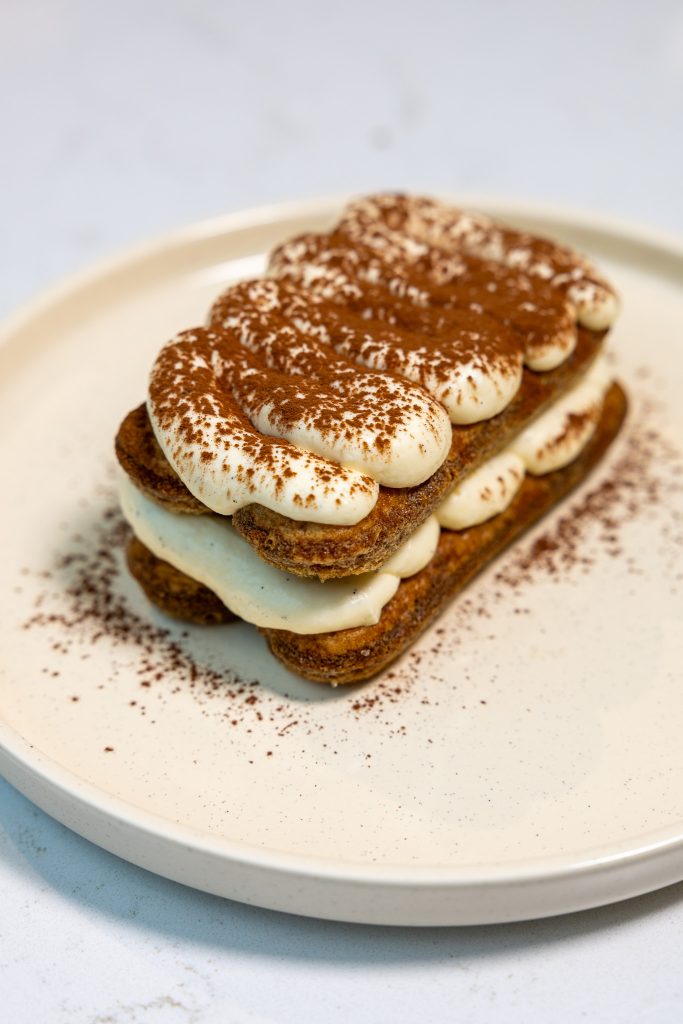Serveer de tiramisu direct. Op deze manier blijven de lagen fris, luchtig en perfect in balans.
