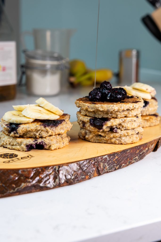 Gezonde havermout-banaan pannenkoeken met blauwe bessen. Luchtig, voedzaam en makkelijk recept voor ontbijt, brunch of verantwoord tussendoortje.