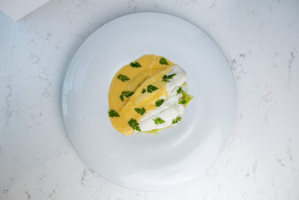 Een gerecht waar verfijning en comfort samenkomen: zachte schol, gepocheerd in een geurige court-bouillon, geserveerd met gestoofde prei en een romige beurre blanc met een vleugje witte miso. Het resultaat is een gerecht dat tegelijk klassiek en eigentijds aanvoelt, ideaal voor wie houdt van Frans koken met een moderne draai.