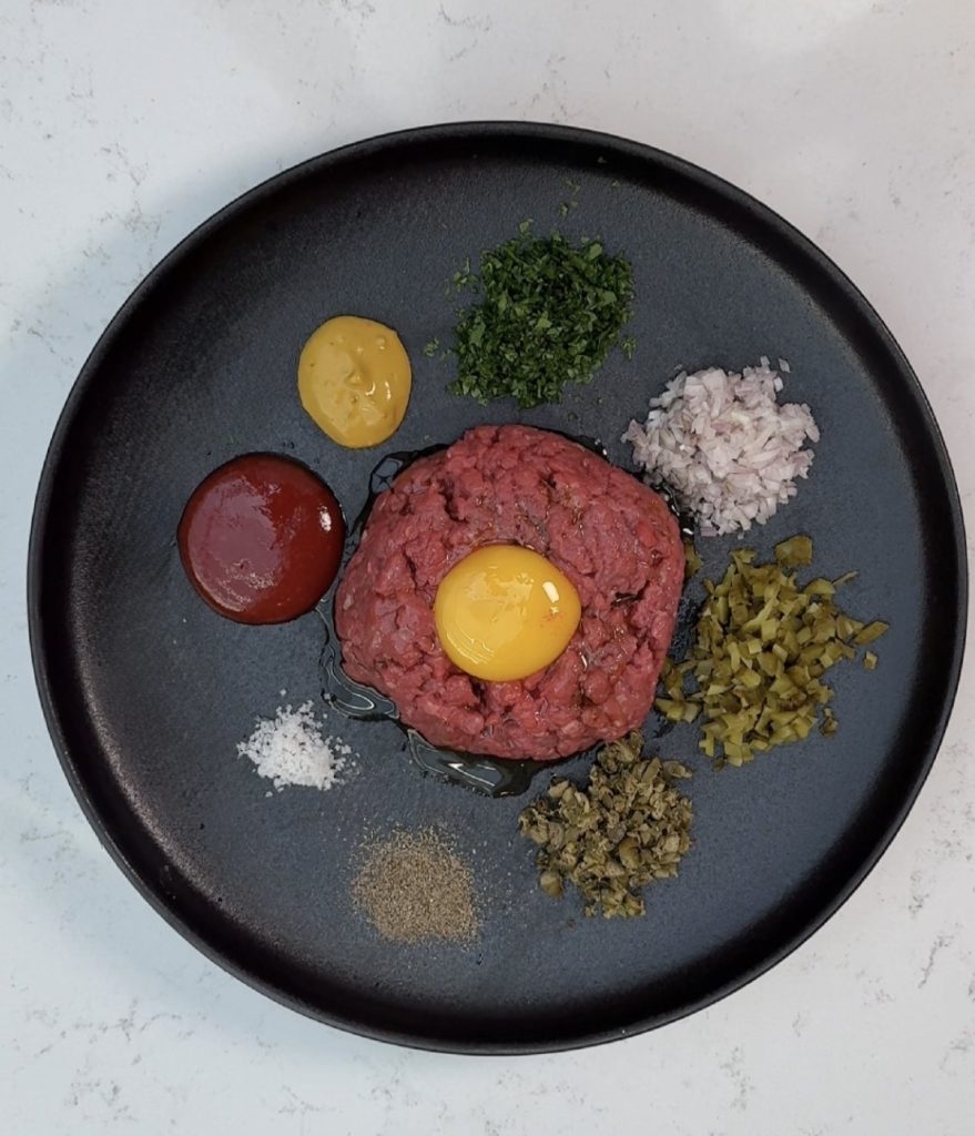 Steak Tartare met fijngesneden rundvlees, klassieke garnituren en eidooier. Een Franse klassieker die je aan tafel zelf mengt.